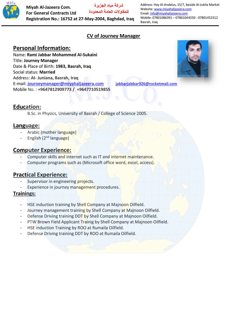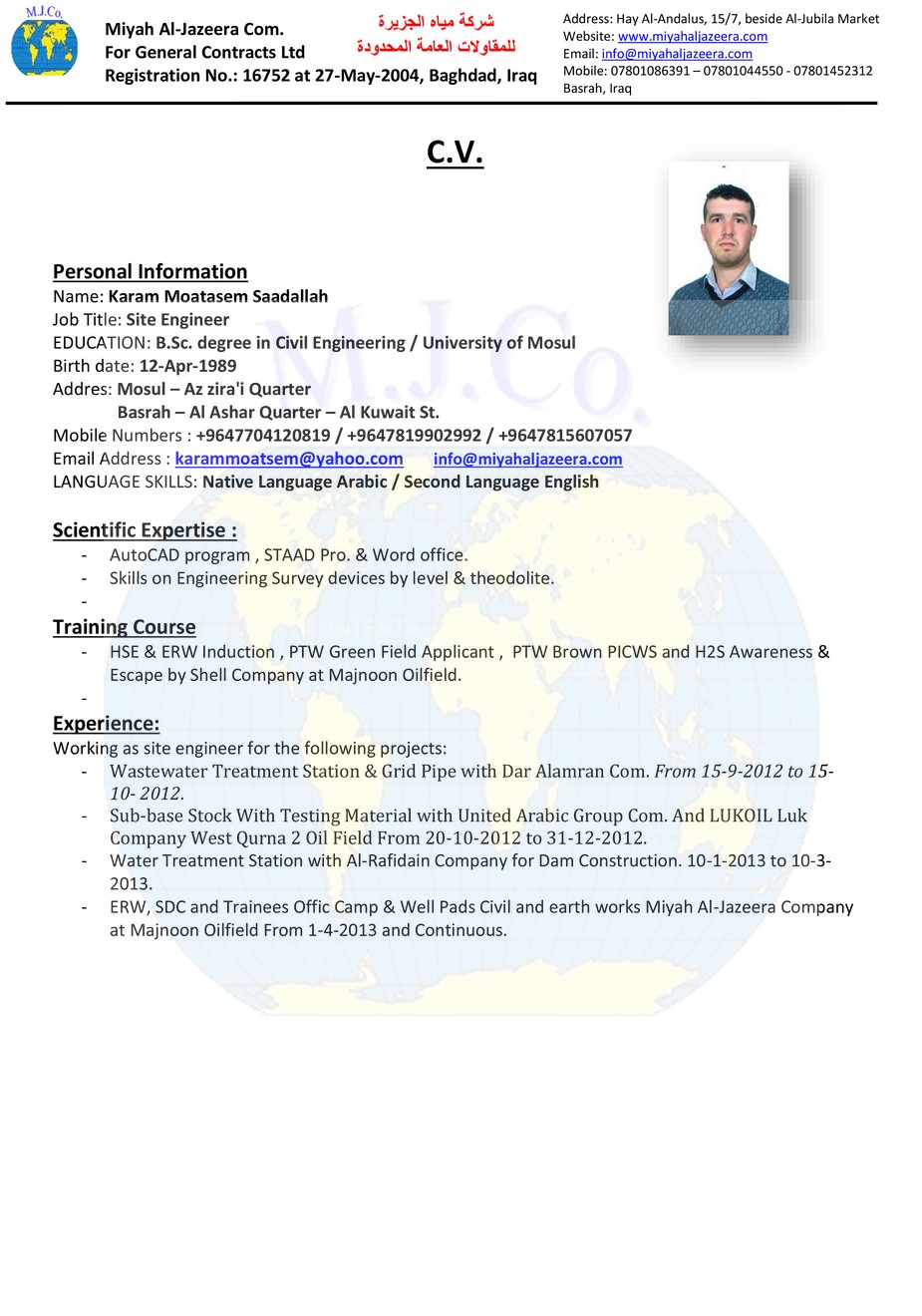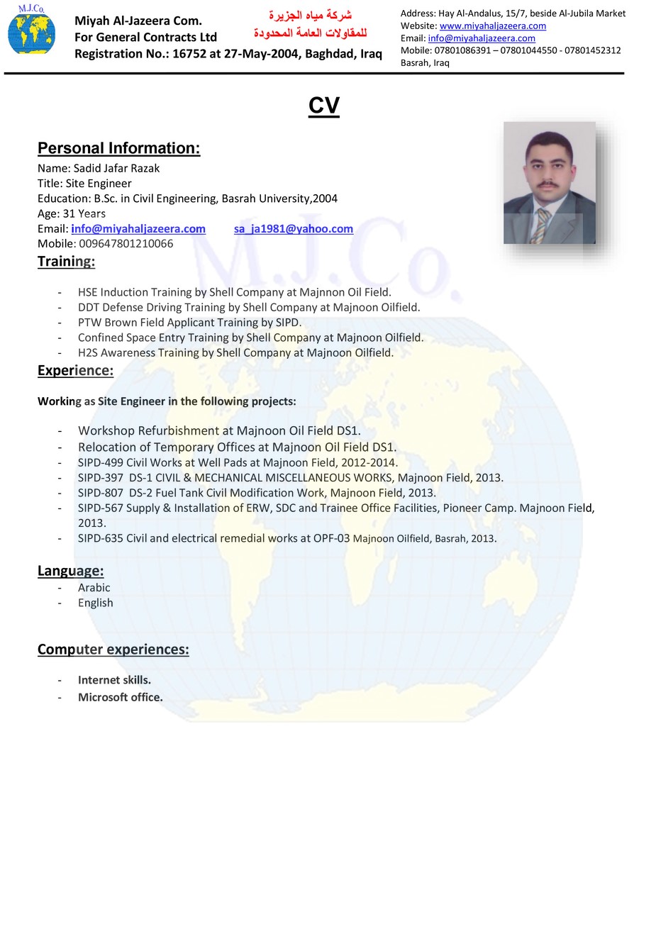 Education: B.Sc. in Civil Engineering, Basrah University,2004