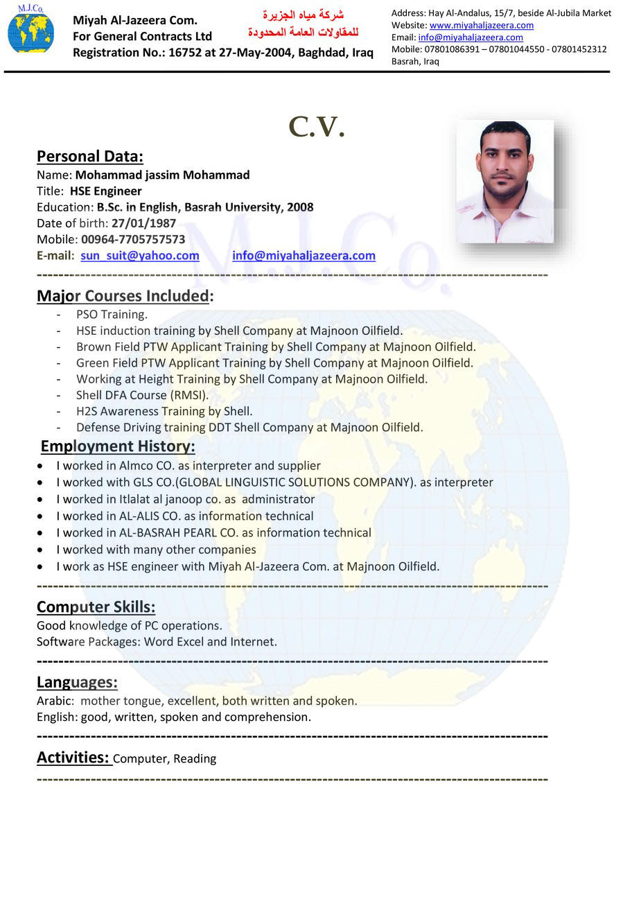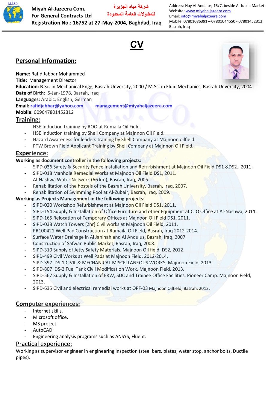 Education: B.Sc. in Mechanical Engg, Basrah Unversity, 2000